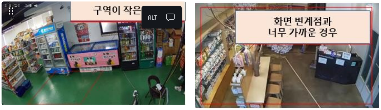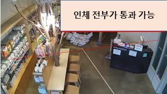 목표 감지 구역은 CCTV 화면의 중앙 부근에 위치해야 하며 구역 경계는 CCTV 화면 가장자리나 가림 막에서 약 500픽셀 떨어져 있어 목표물이 들어오거나 빠져나가는 움직임이 카메라에 잡힐 수 있도록 설치합니다.