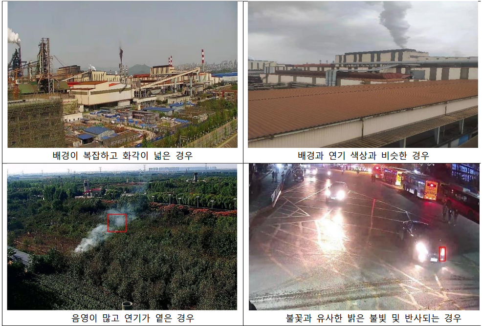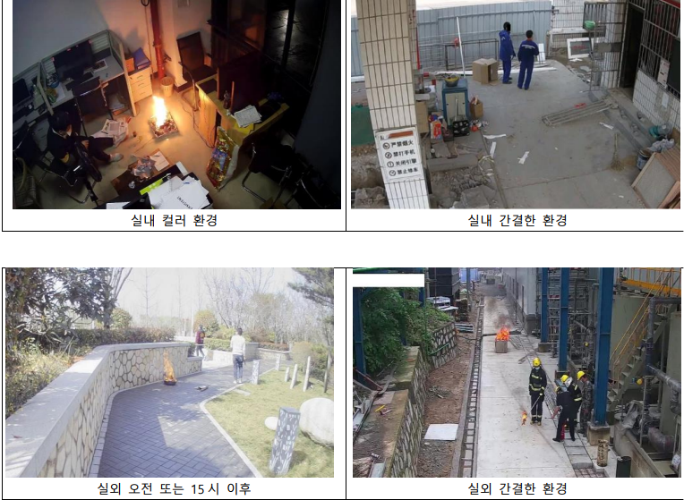 실내외 높이는 모두 2.0m~4.0m, 평면시각은 15°~60°, 최적각은 30°~45°,왜곡이 없는 화면; 화염 연소가 15초 이상 지속되는 일반 화재, ,라이터 화염, 회백색 짙은 연기
