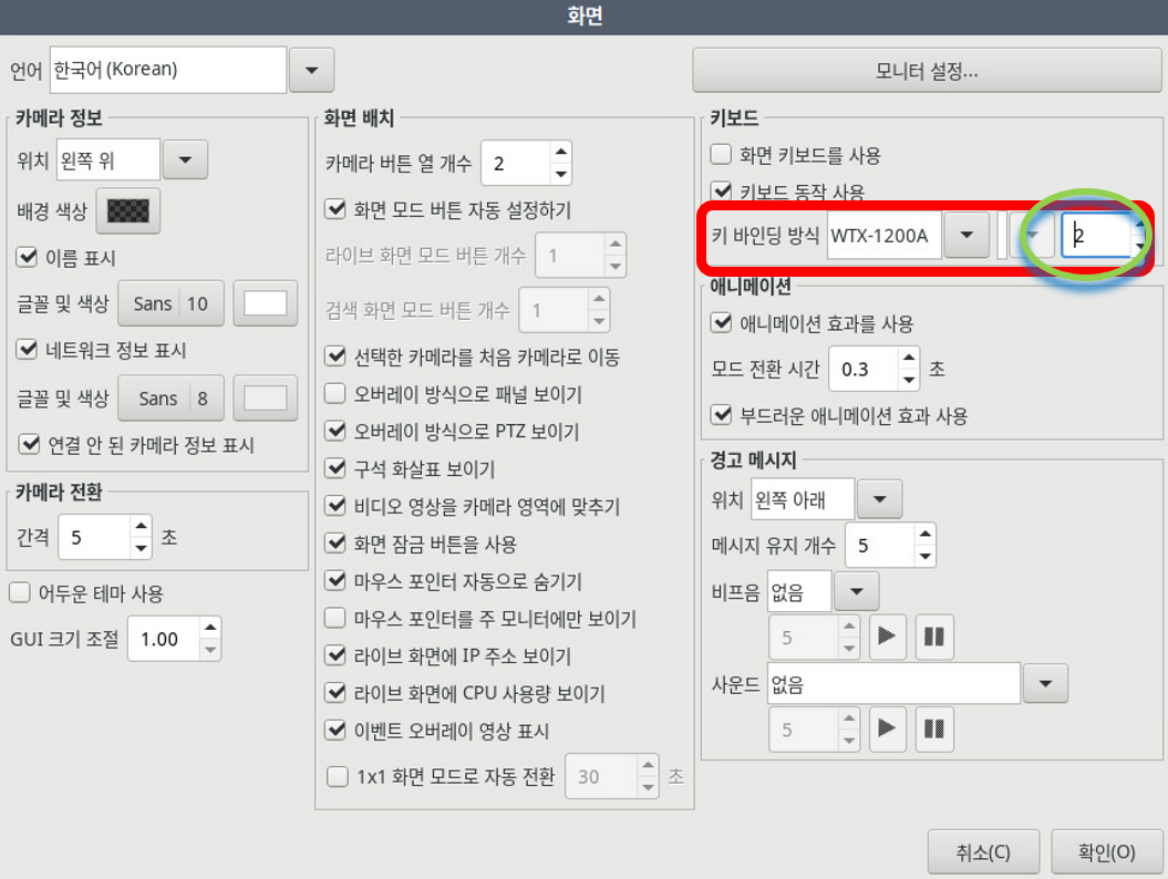 "설정 화면" 키보드 동작 사용에 체크 후 키 바인딩 방식을 제조사에 맞게 체크합니다. 키 바인딩 방식 체크 후 ID 설정(키보드 컨트롤러 ID와 동일한 설정 필요)