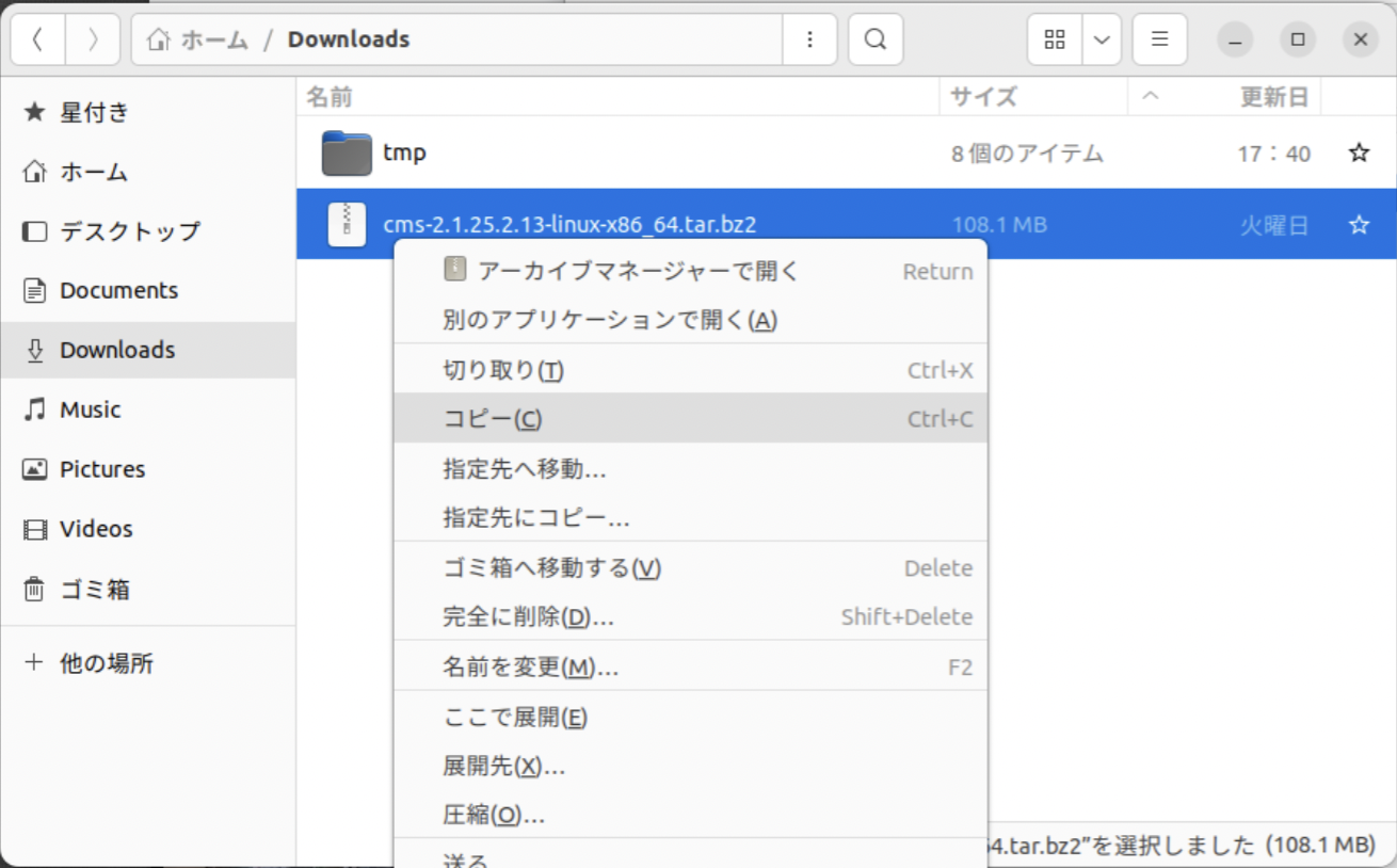 左に接続されているUSBメモリを選択し、ダウンロードしたファイルを右クリックしてコピーします。