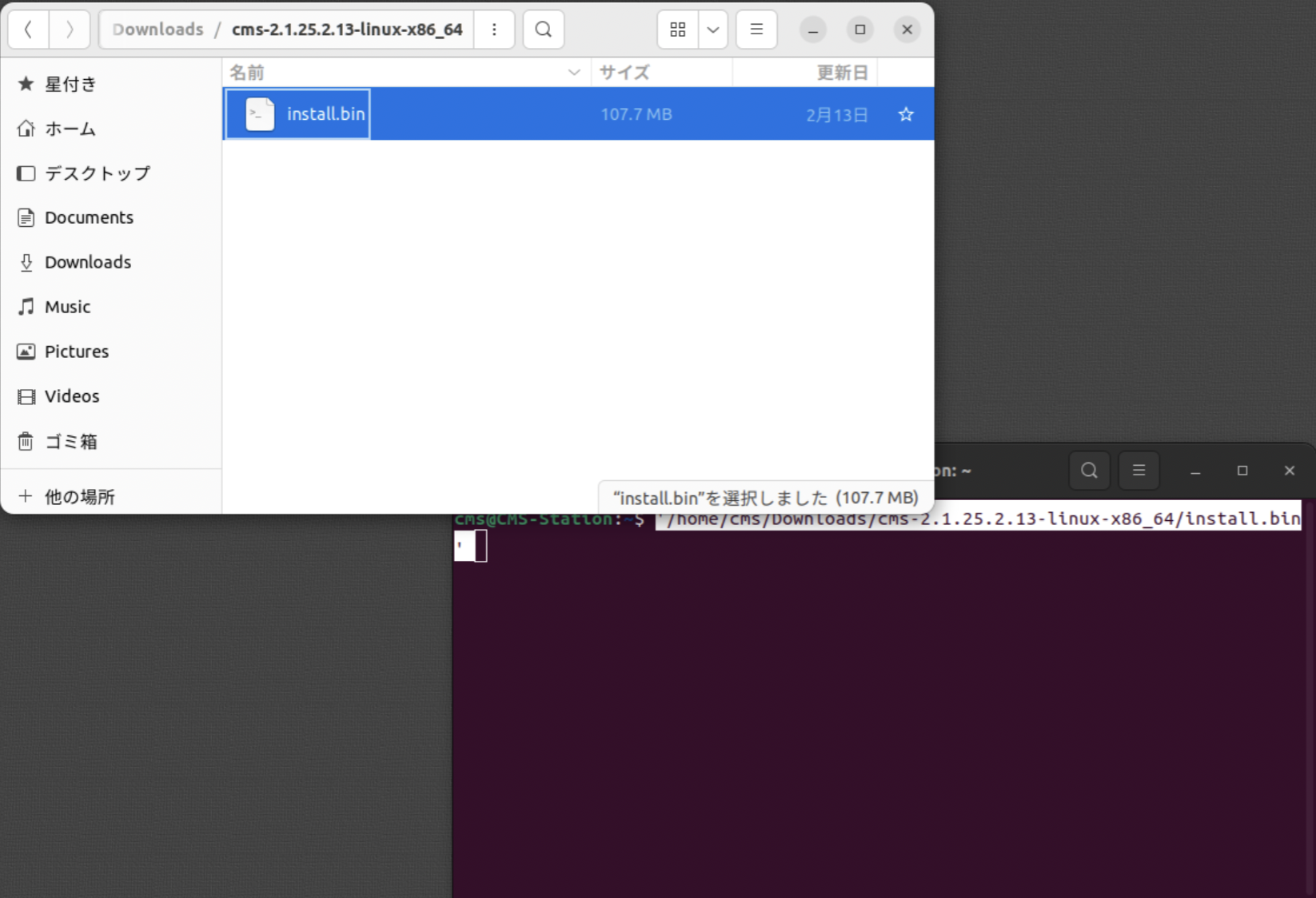 install.bin ファイルをマウスで選択してドラッグし、端末ウィンドウにドロップします。