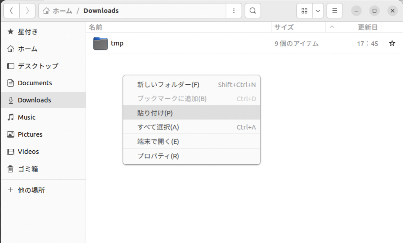 左のDownloadsフォルダーを選択してマウスを右クリックして貼り付けます。