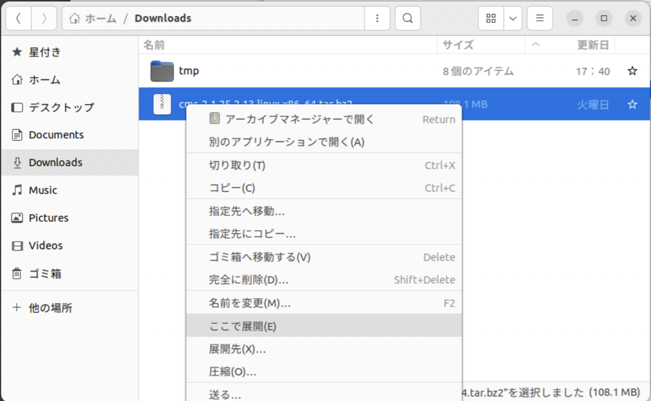 コピーしたファイルを右クリックして"ここに展開"を選択します。