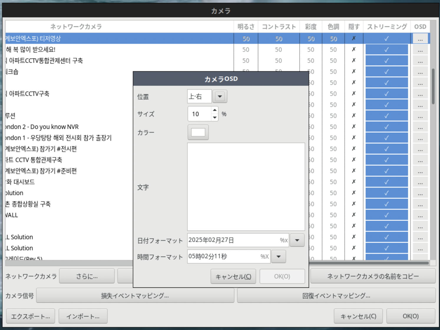 OSD設定により、各カメラチャンネルに特定の文字を表示できます。