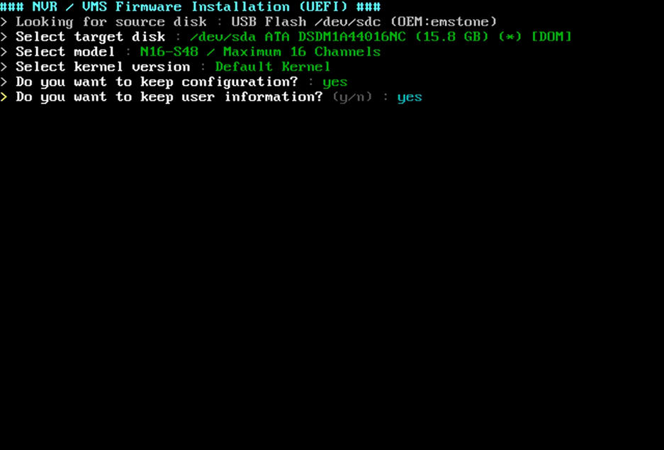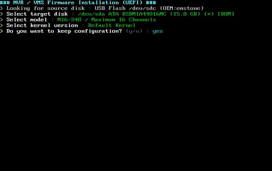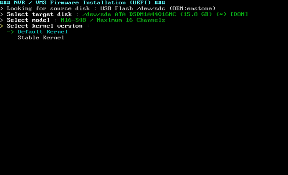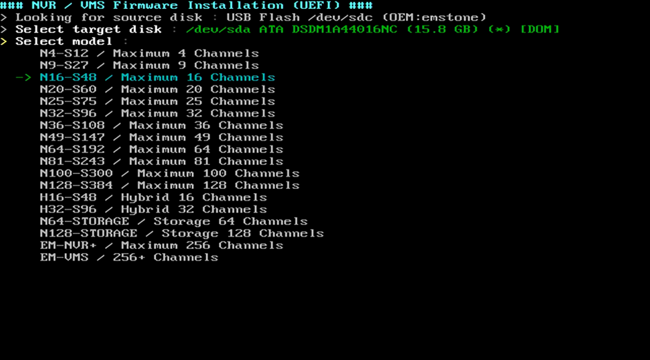 This is the drive selection window to install. You can select the DOM-SSD drive that is installed in the NVR. Be careful not to select the HDD that is installed for storage (the recording will disappear)