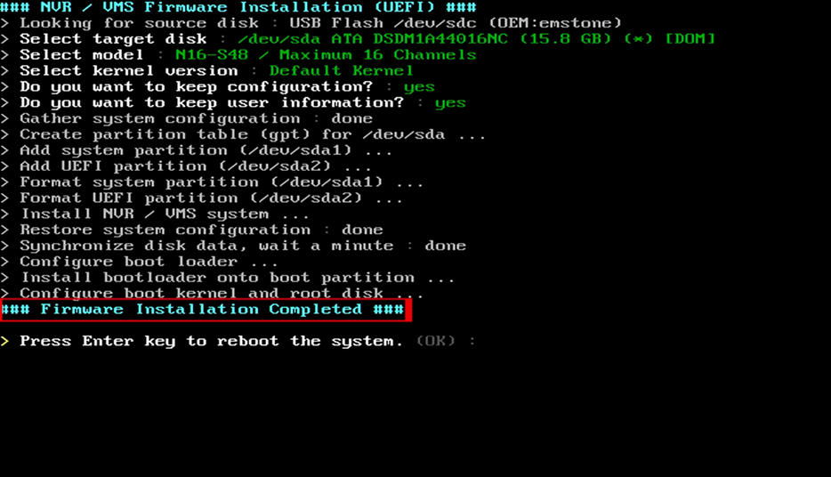 This is the installation complete window. Please check the ###FirmwareInstallationCompleted #### and remove the installation USB and press "OK" to reboot the NVR.